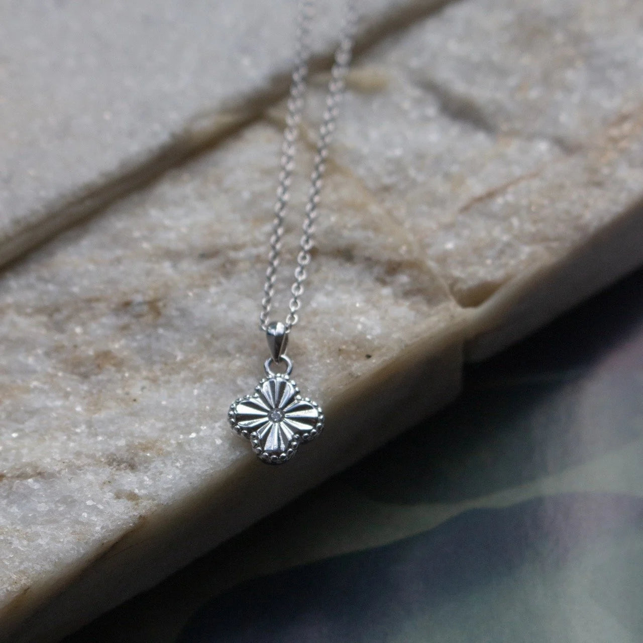 Add a touch of timeless elegance to your everyday style with our Clover Flower Pendant Necklace. Available in both 14K gold-plated and sterling silver finishes, this dainty piece features a delicate clover-shaped pendant with a sparkling cubic zirconia stone at its center.