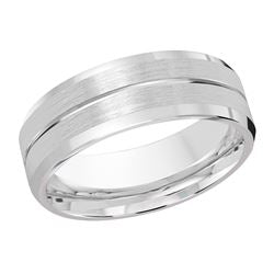 This elegant 8mm white gold wedding ring features a high polish groove along its satin center and is finished off with slanted high polish edges.
