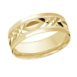 This 8mm yellow gold wedding ring features an exquisite diamond cut carving a long its satin center embellished with milgrain and high polish edges.