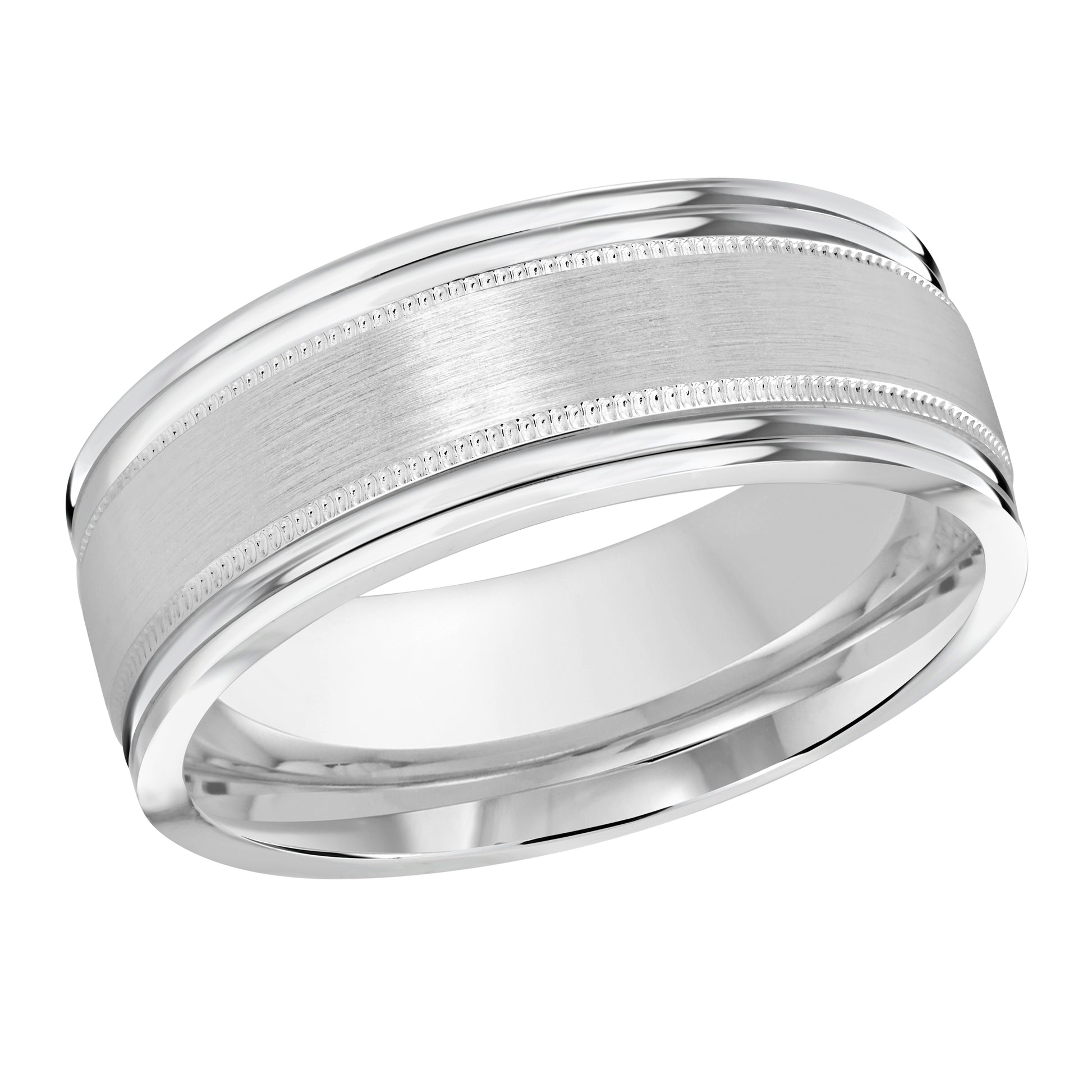 This 8mm white gold wedding ring features a satin center surrounded by milgrain and double-grooved high polish edges.