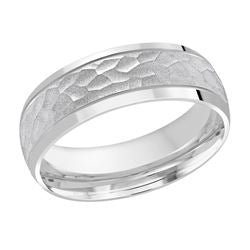 This best seller 7mm white gold wedding ring feature an elevated hammered center with high polish edges and the ring is finished off with high polish flat edges.