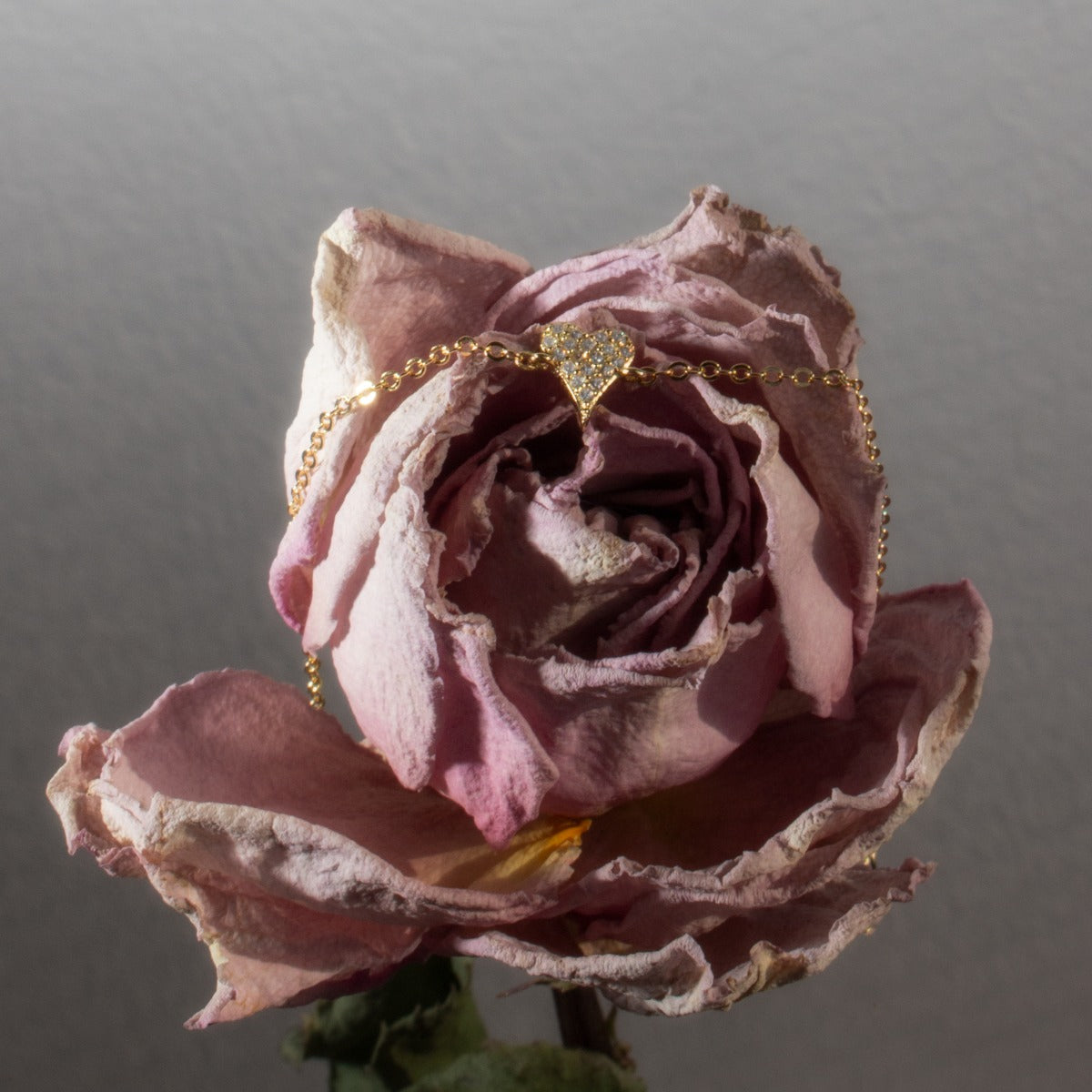 This sterling silver mini heart bracelet is finished in luminous gold vermeil and accented with shimmering CZ pavé stones for a delicate yet eye-catching look. The petite heart charm sits gracefully on a fine chain, making it perfect for everyday wear or layering with your favourite bracelets.