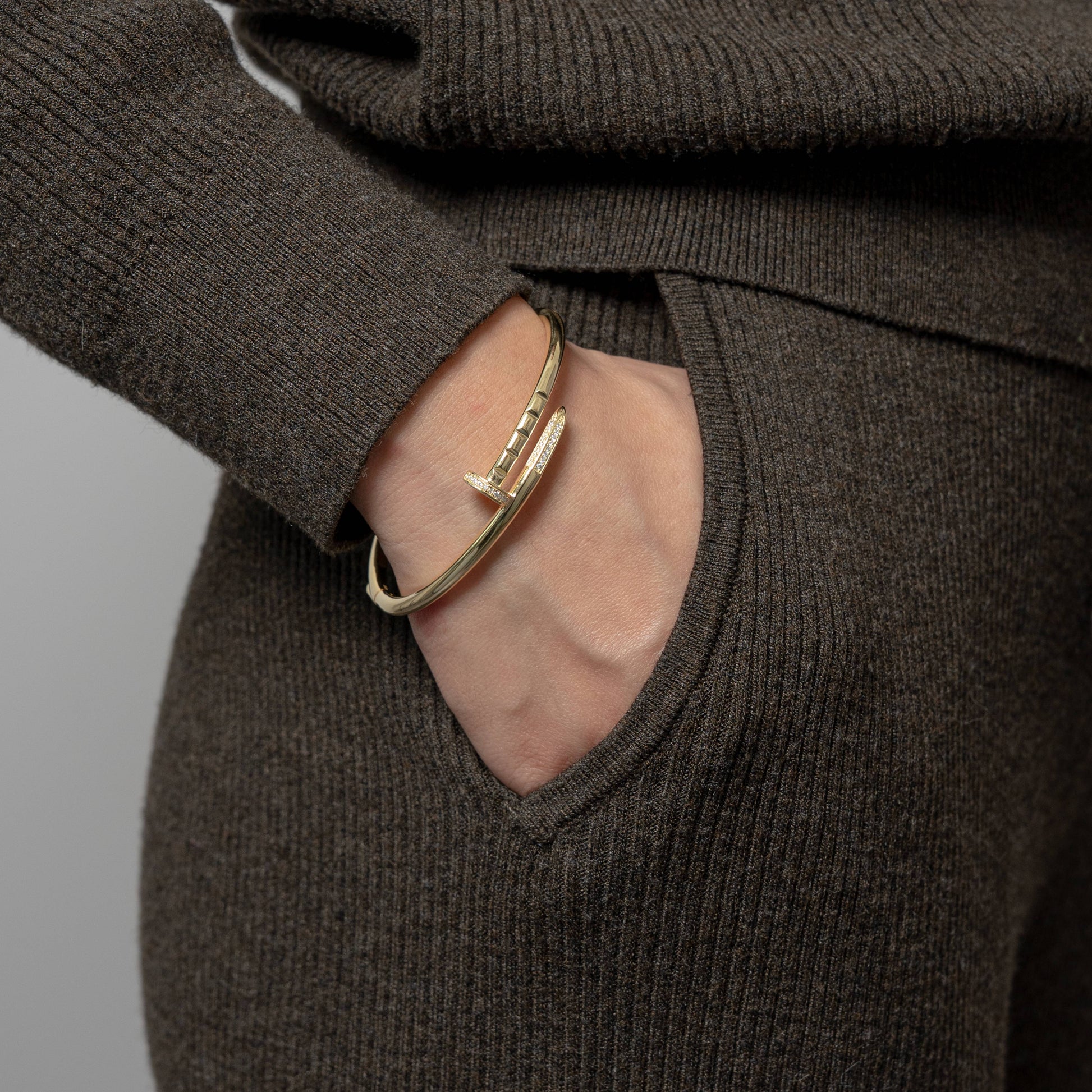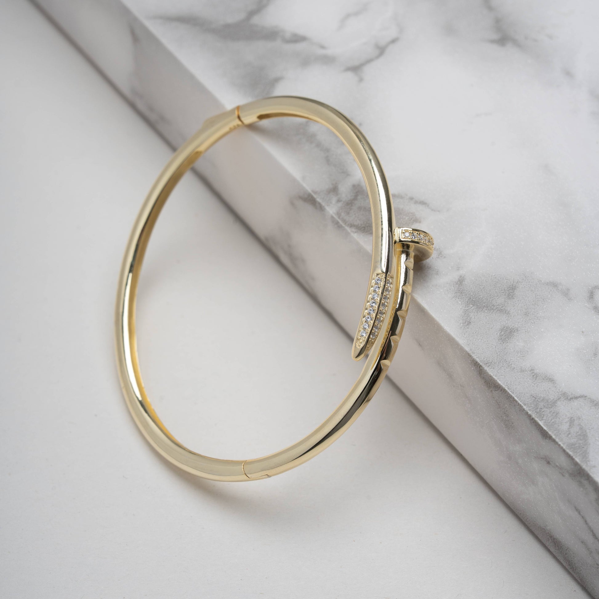 This sterling silver nail-inspired open bangle is finished in rich gold vermeil and accented with shimmering CZ stones for a luxe, high-impact look. The sleek nail silhouette wraps effortlessly around the wrist, blending modern design with timeless elegance.